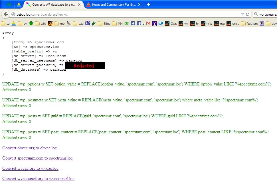 To facilitate running Convert-WordPress I defined a domain named debug.loc on my testing server so that I can run Convert-WordPress by going to http://debug.loc/convert-wordpress.php. I didn’t try to write Convert-WordPress as a plugin because I thought it might be problematic to convert WordPress while running WordPress. Plus I find it more convenient to synchronize my testing server in bulk (i.e., backup several sites, restore several databases to the testing server, click through each link in the conversion program).