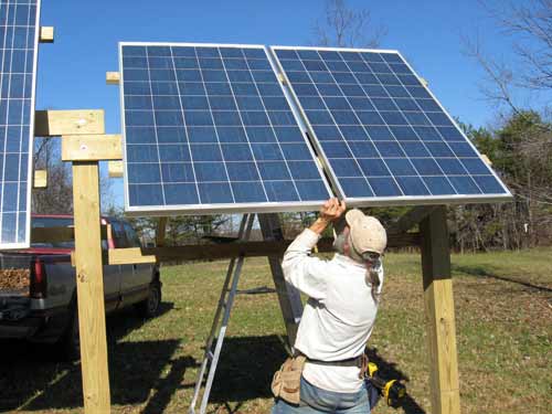 Mary and I live off grid, so we wanted to mount our panels near ground level, where we could easily keep the snow off (i.e., not on a two story tin roof) and adjust the panel angle seasonally, because every watt is sacred in a non-grid-tie system, especially December through February in WV. Also, the panels would be more efficient in warm weather (due to being cooler than if mounted on a hot tin roof). We didn’t want to spend a lot of money on a pole-mount rack, so I came up with a simple design that we built from treated lumber, common hardware and hinges.