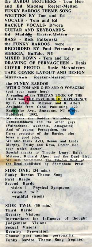 | SIDE ONE: (34 min.) Funky Bardos Theme Song First Bardo Second Bardo vision 1 Physical Symptoms vision 2 to 7 wrathful visions |